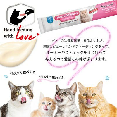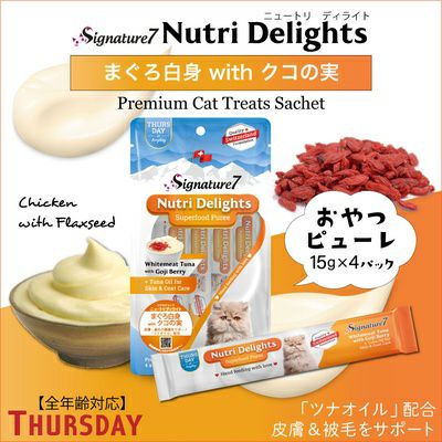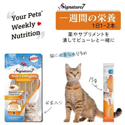他の画像を見る 【賞味期限 2026年5月18日】シグネチャー7 ニュートリ ディライト ピューレ まぐろ白身withクコの実 (木) 15g×4本 保護団体様としてご登録の方は支援価格が表示されます 一般通常価格 ¥ 400 税込 カートに入れる お気に入りに登録する